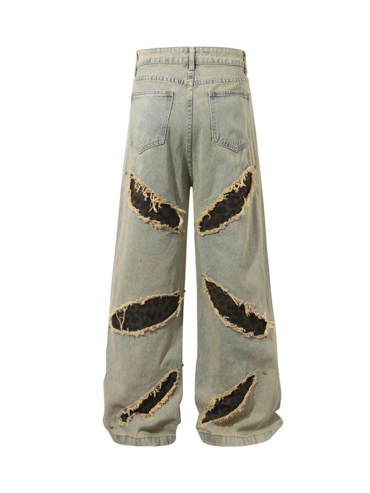• Design Elements: Leopard-print patches, multiple distressed holes, button fly closure
