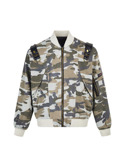 Camouflage Leather Shoulder Pad Denim Bomber Jacket