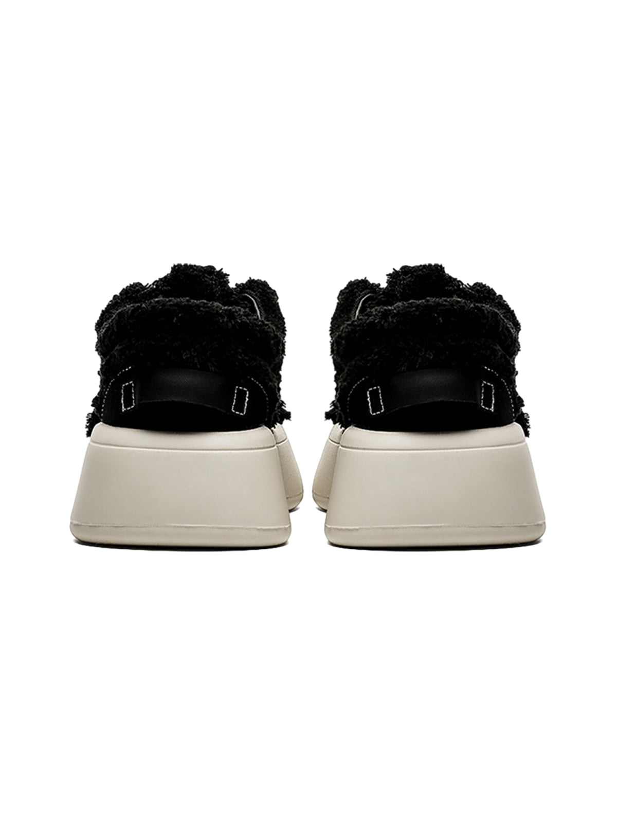 • Design Elements: Chunky white sole, fuzzy trim details, contrasting white laces