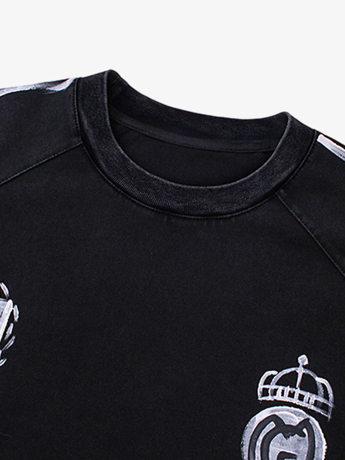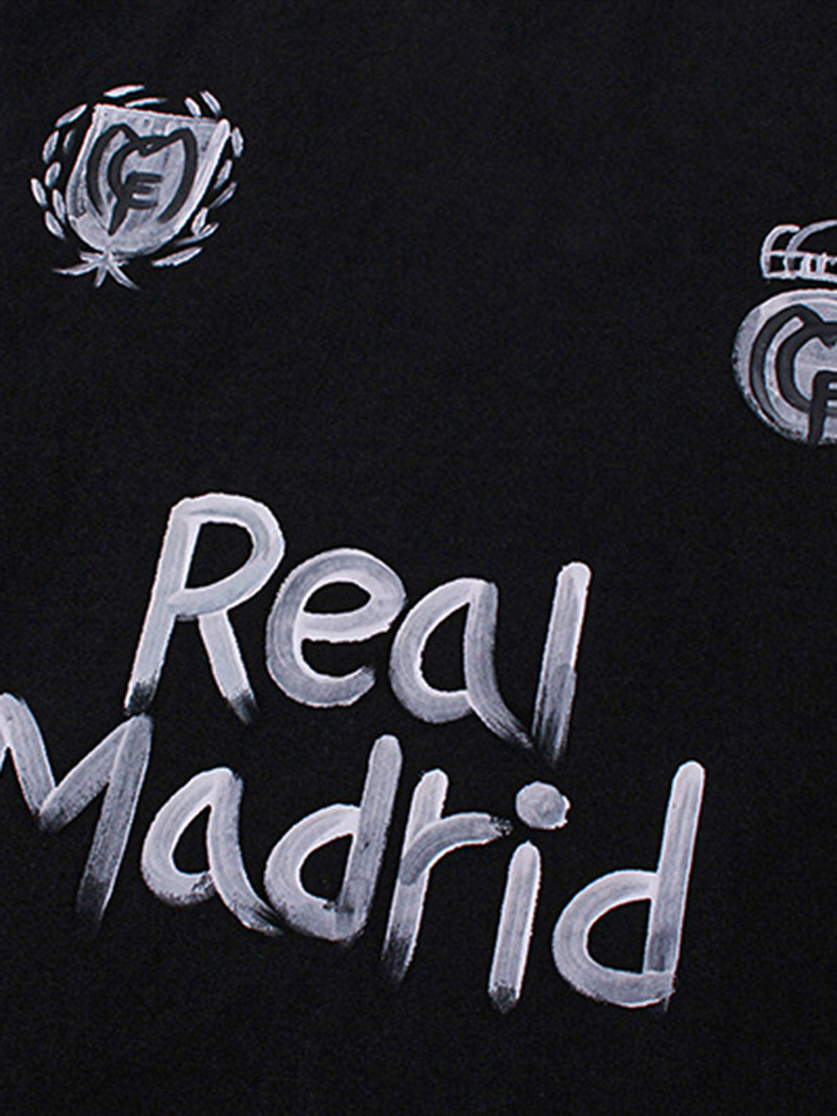 • Design Elements: Embroidered team crests on shoulders, cursive text design on the front, contrast stripe detailing on sleeves