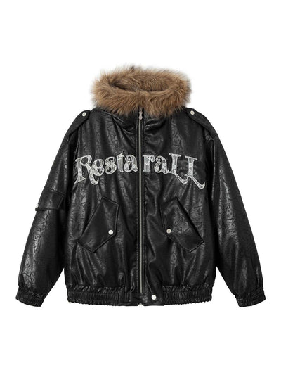 Lace Lettering Fur Hooded Leather Quited Jacket