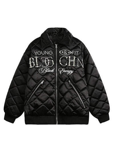 Alphabet Patch Embroidered Quilted Denim Bomber Jacket - 2311