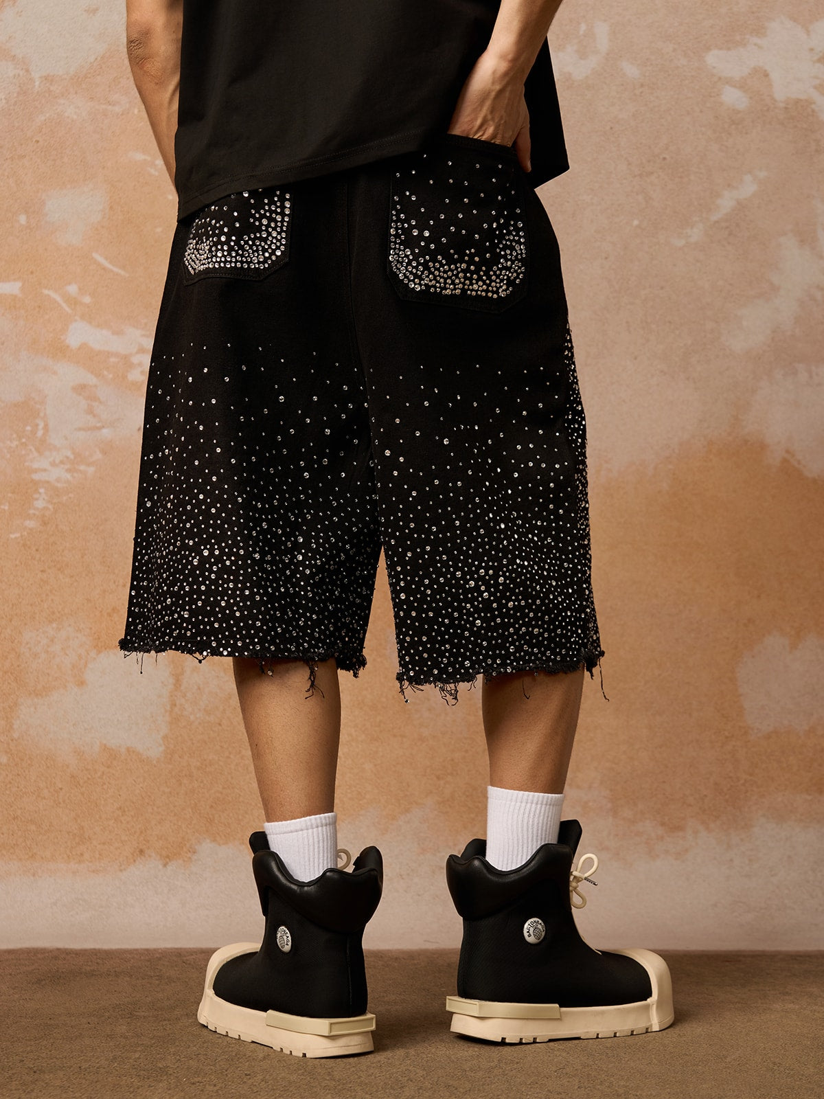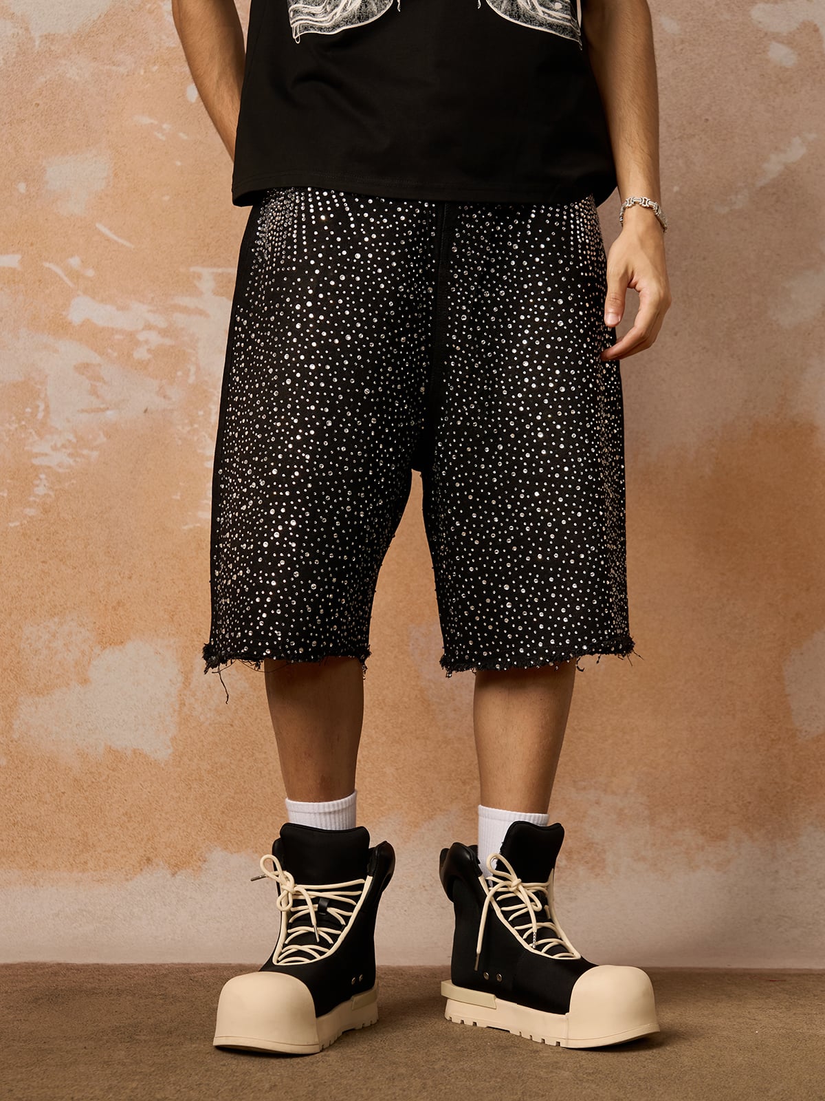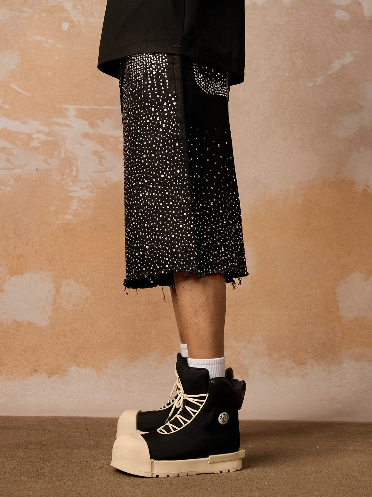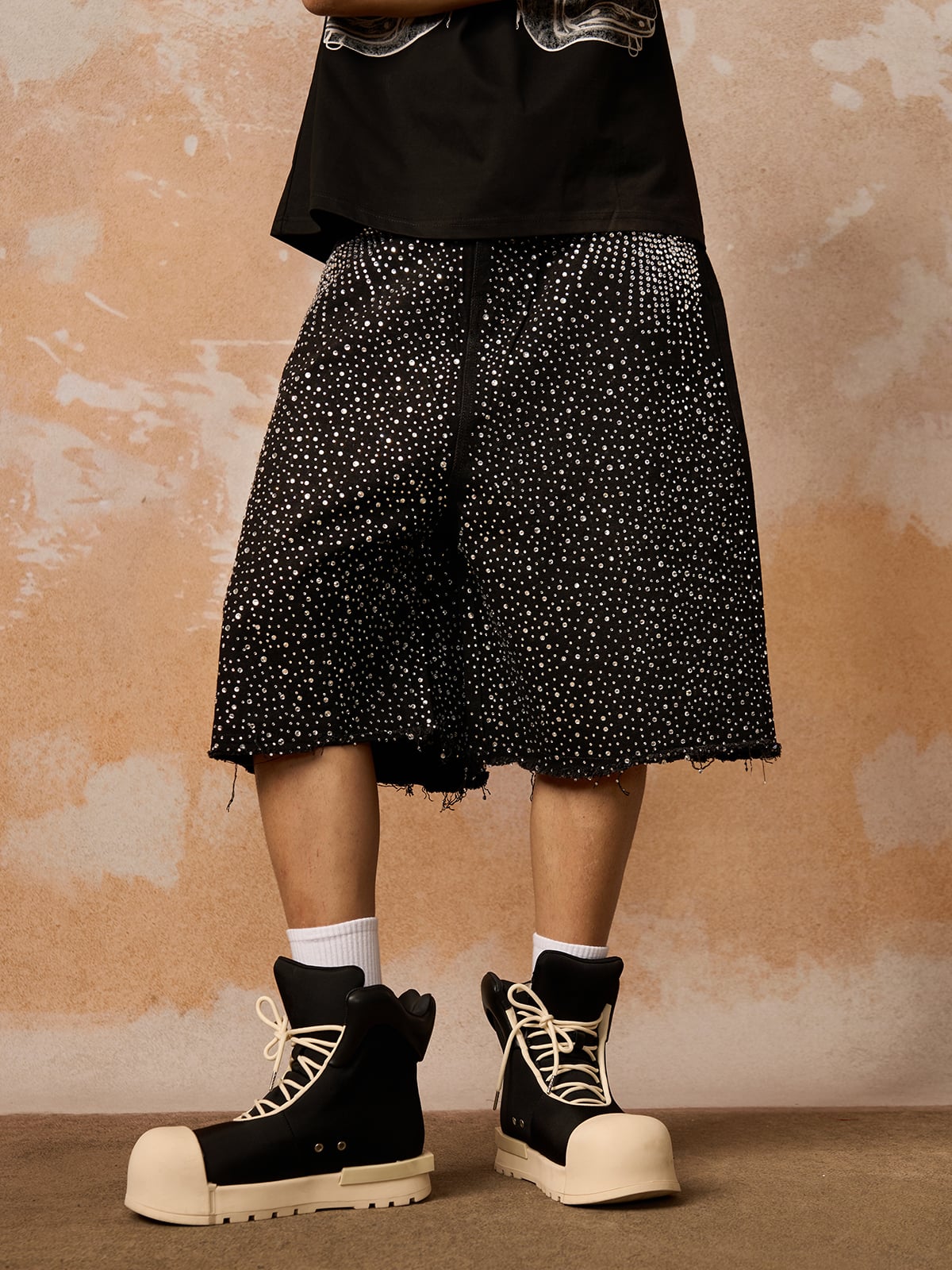 • Design Elements: Unique embellished culottes paired with a sleek black t-shirt featuring a bold logo