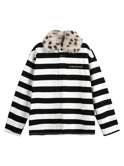 Striped Detachable Fur Collar Long-Sleeve T-shirt - 2397