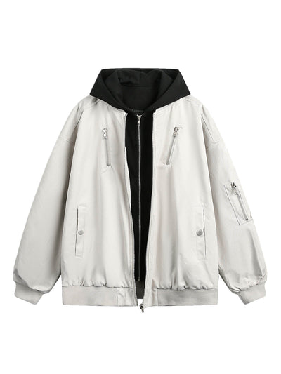 Faux Two-Piece Multi Pocket Spliced Hooded Bomber Jacket