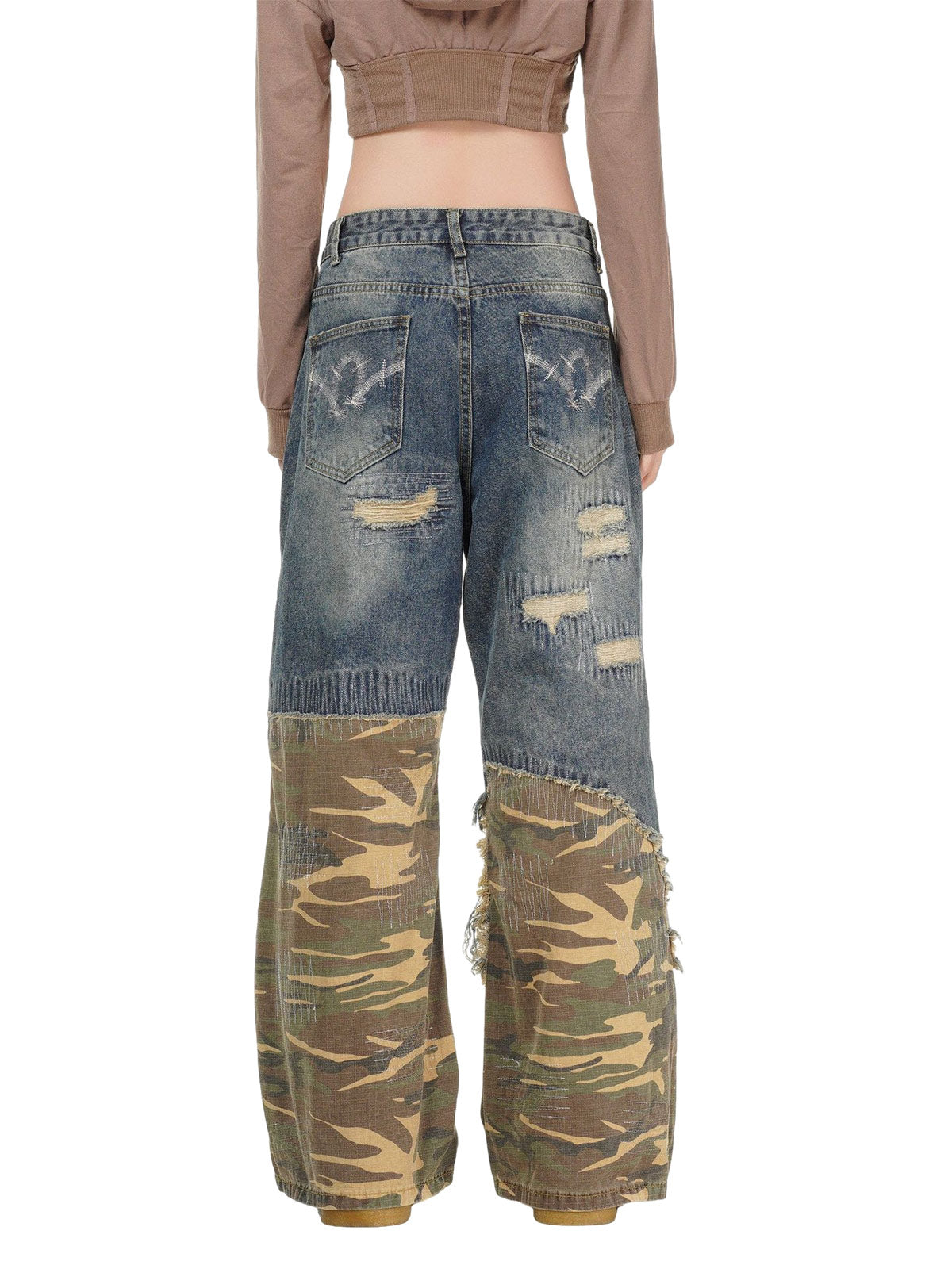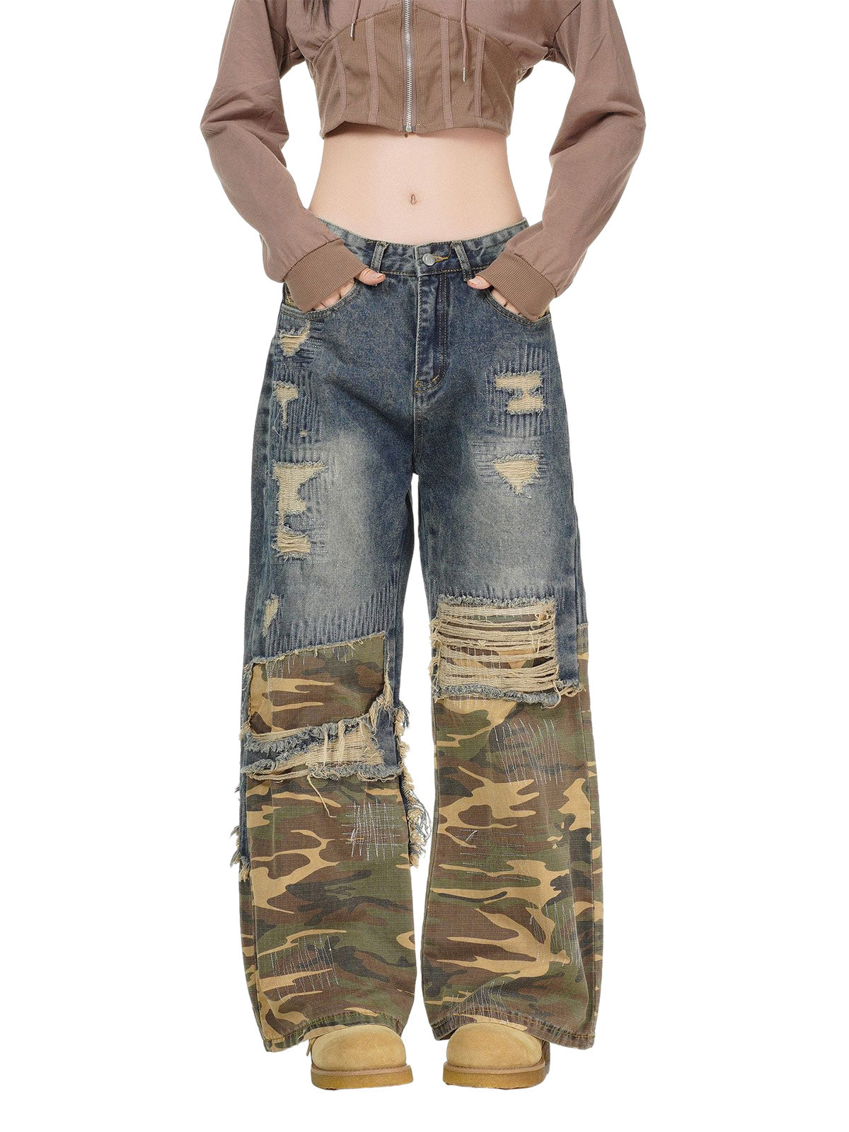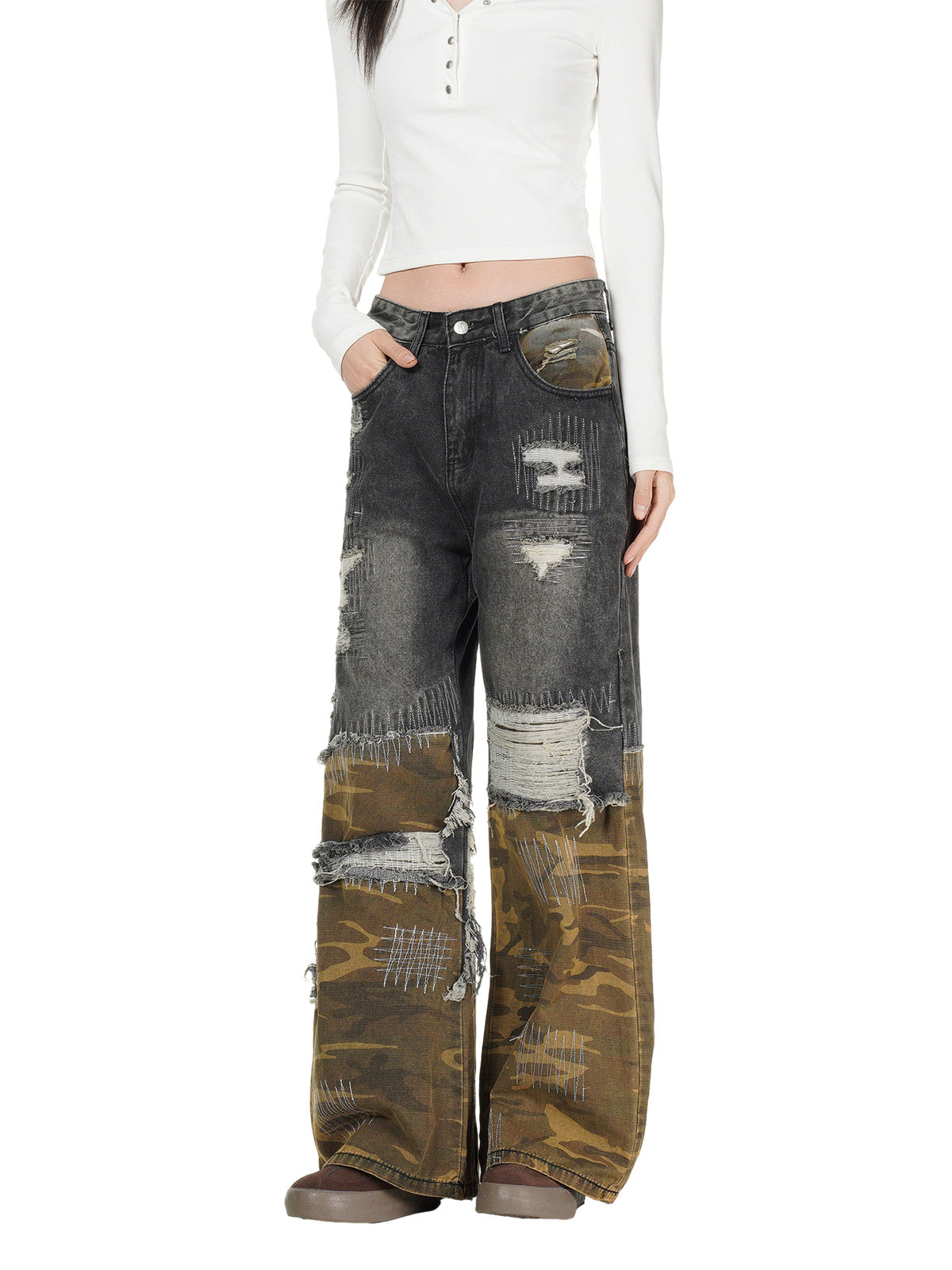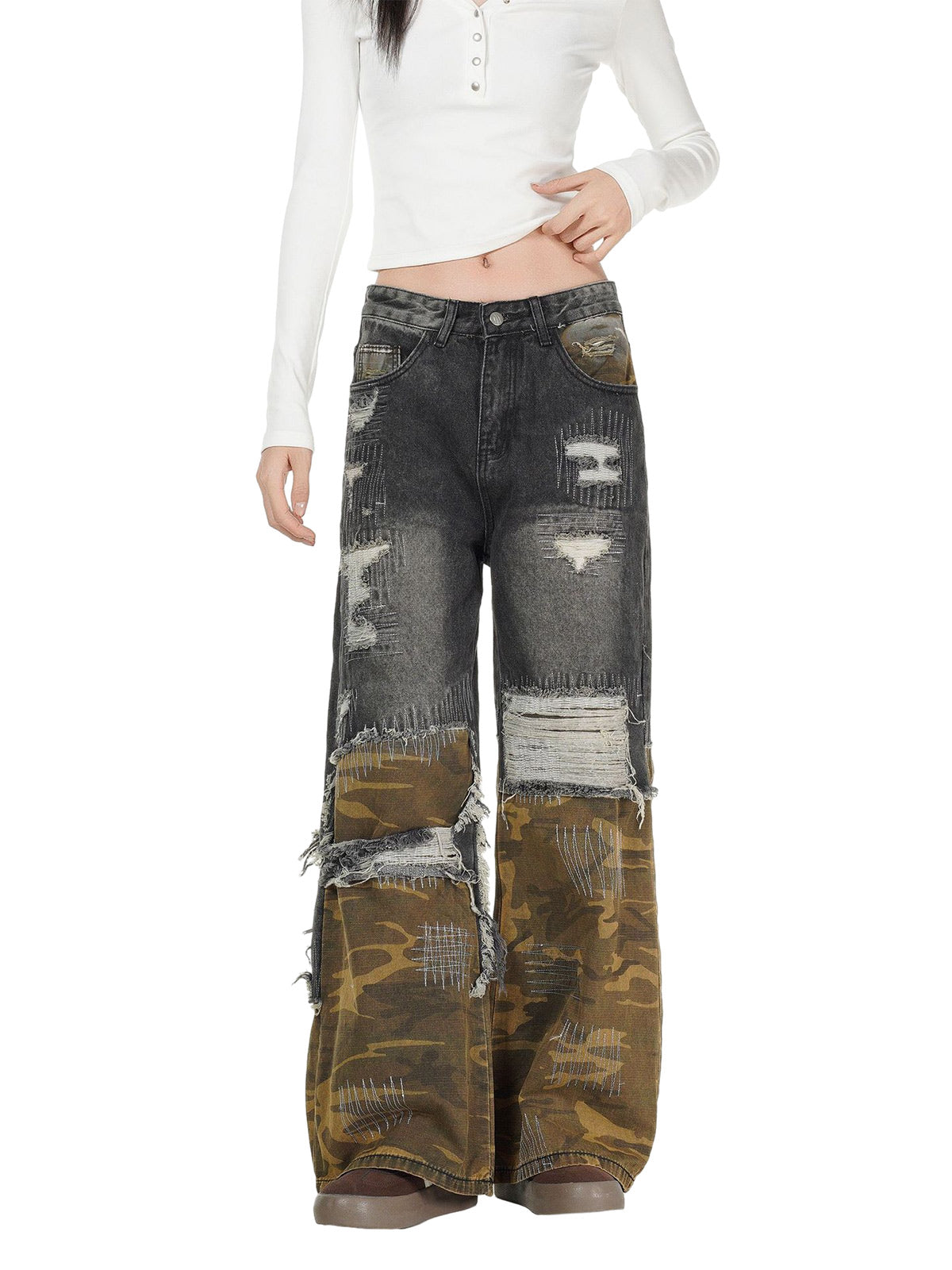 • Detail Features: Ripped details with camouflage patches, wide-leg cut, high-rise waist