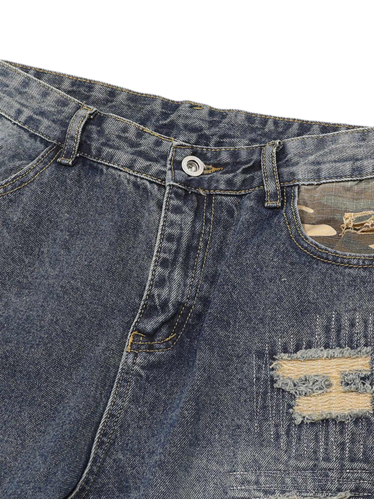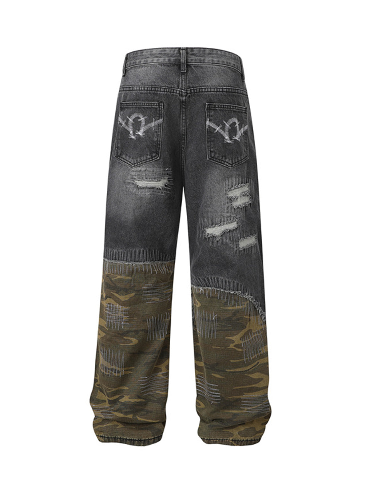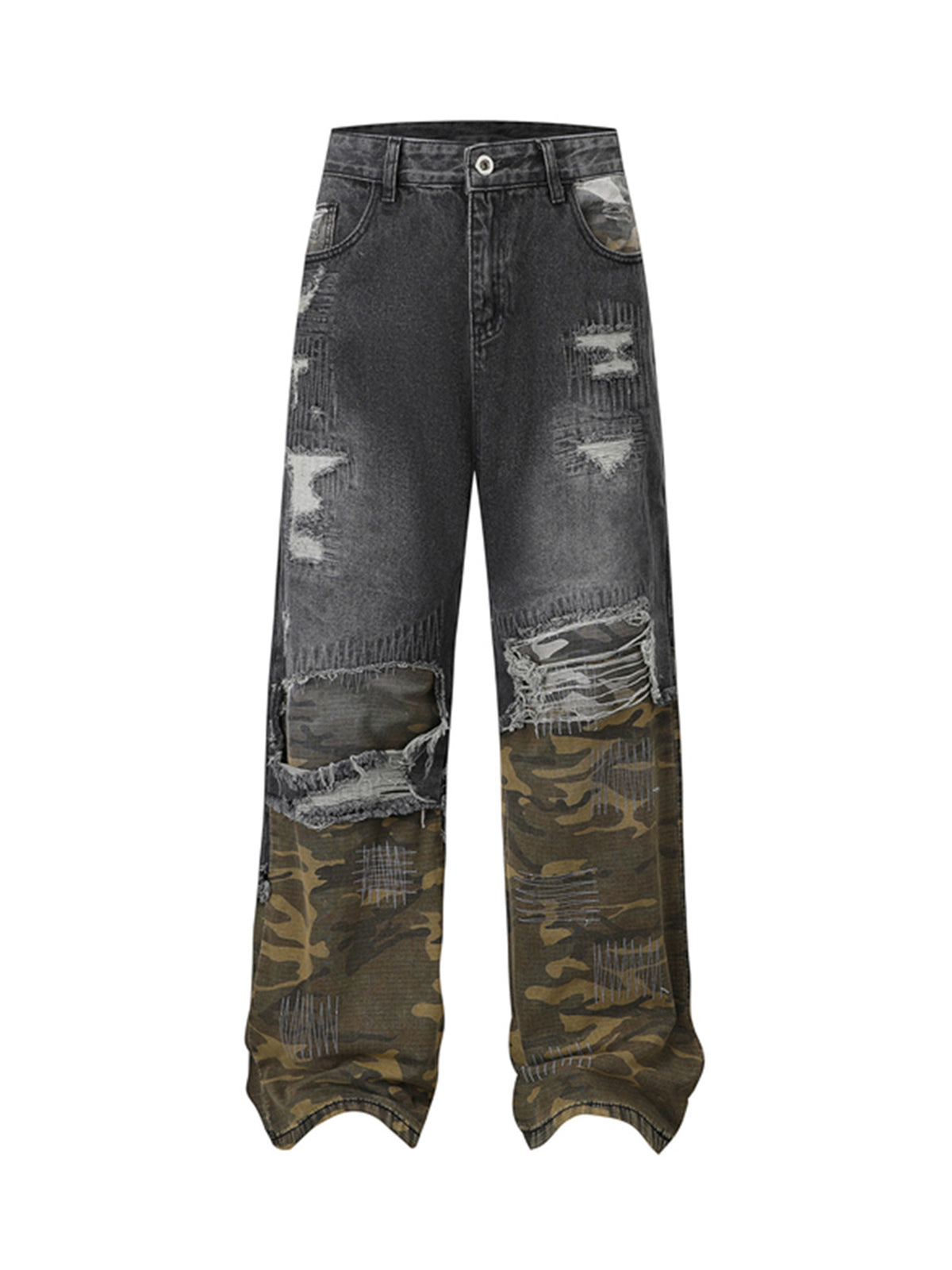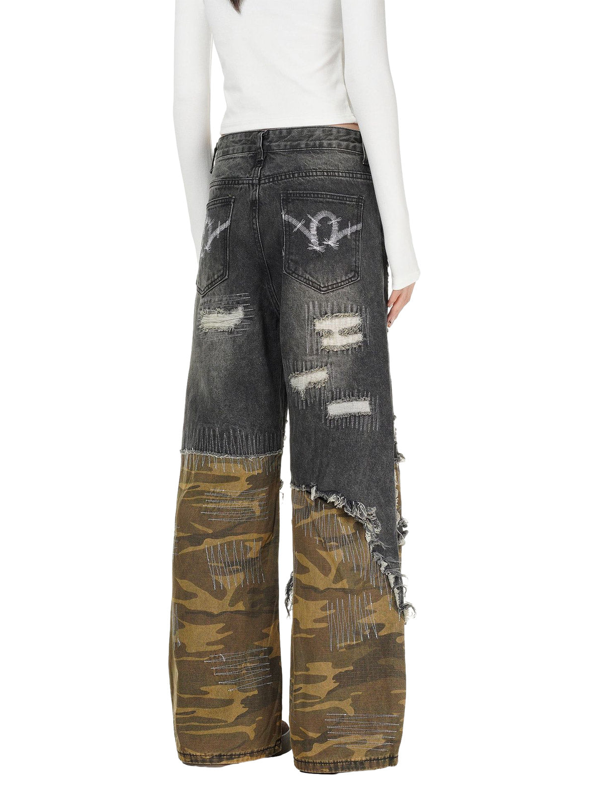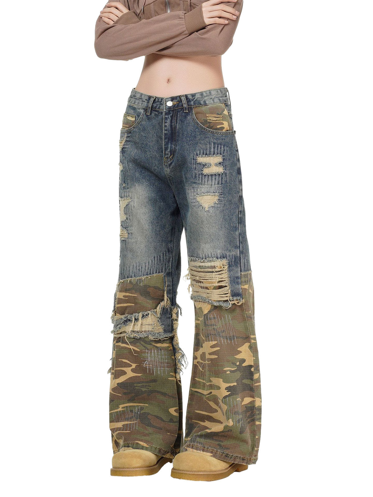 • Detail Features: Ripped details with camouflage patches, wide-leg cut, high-rise waist