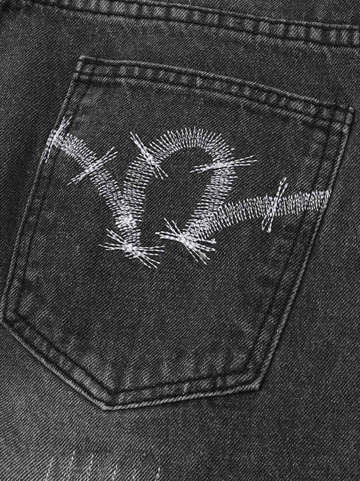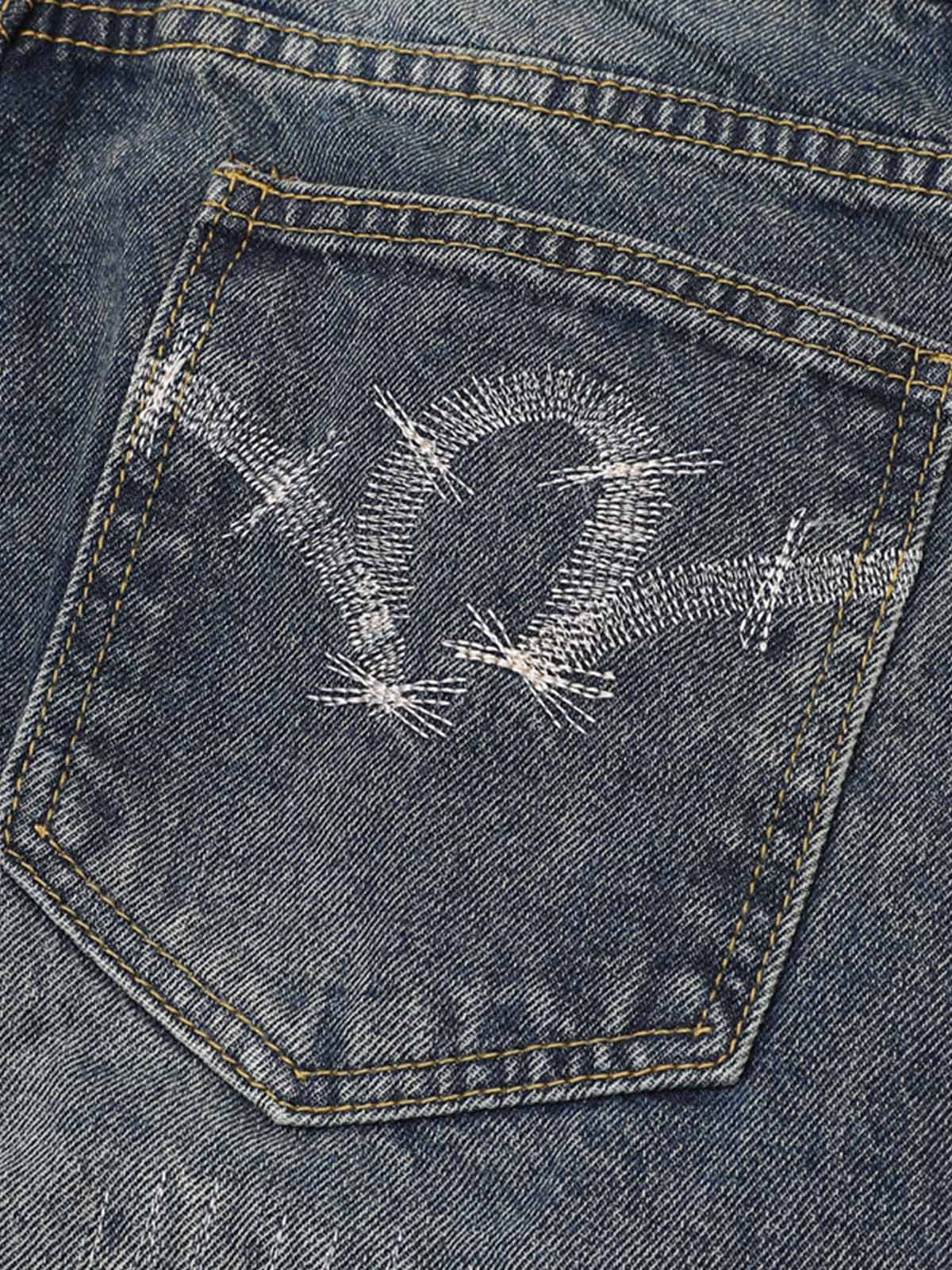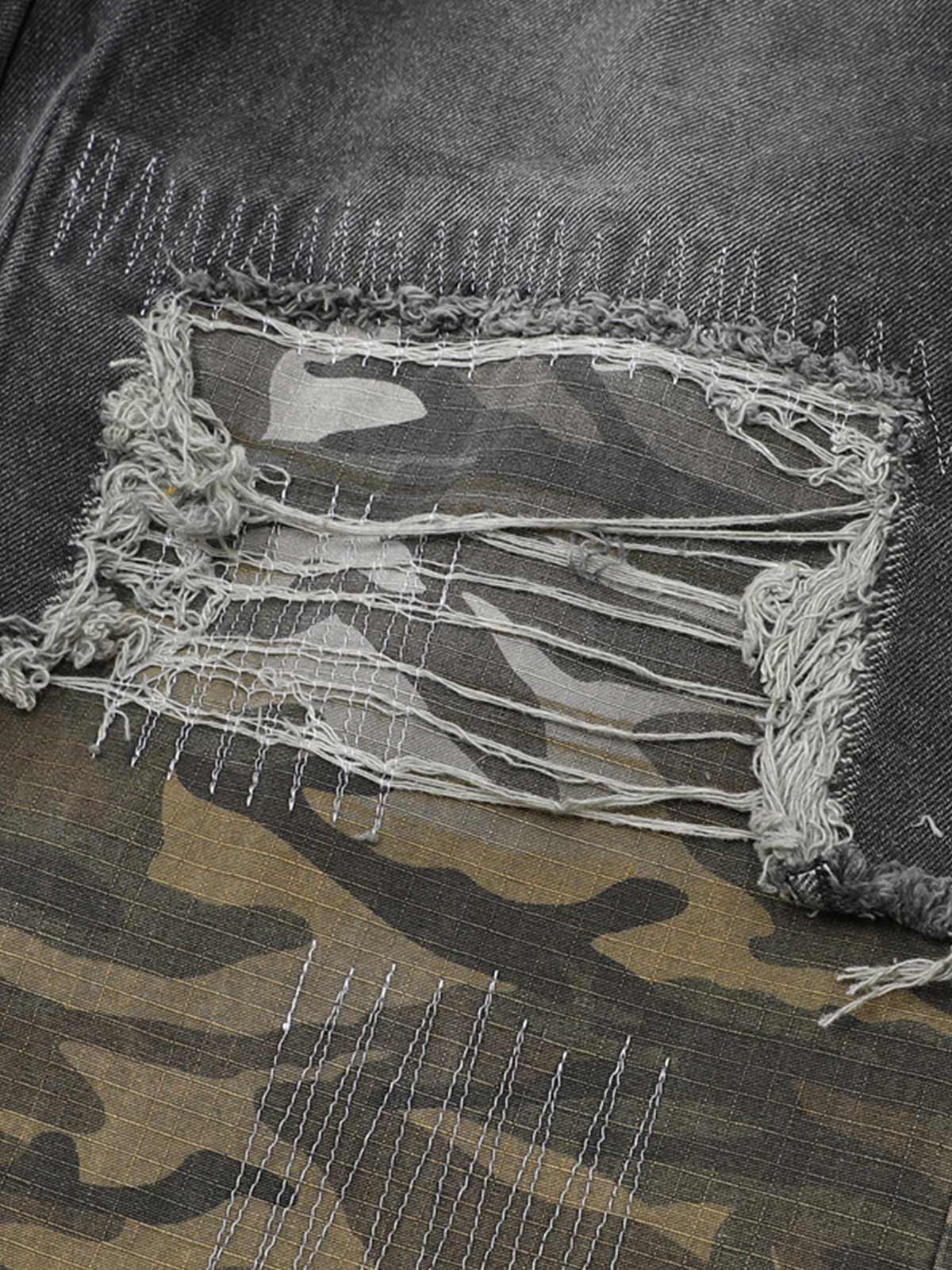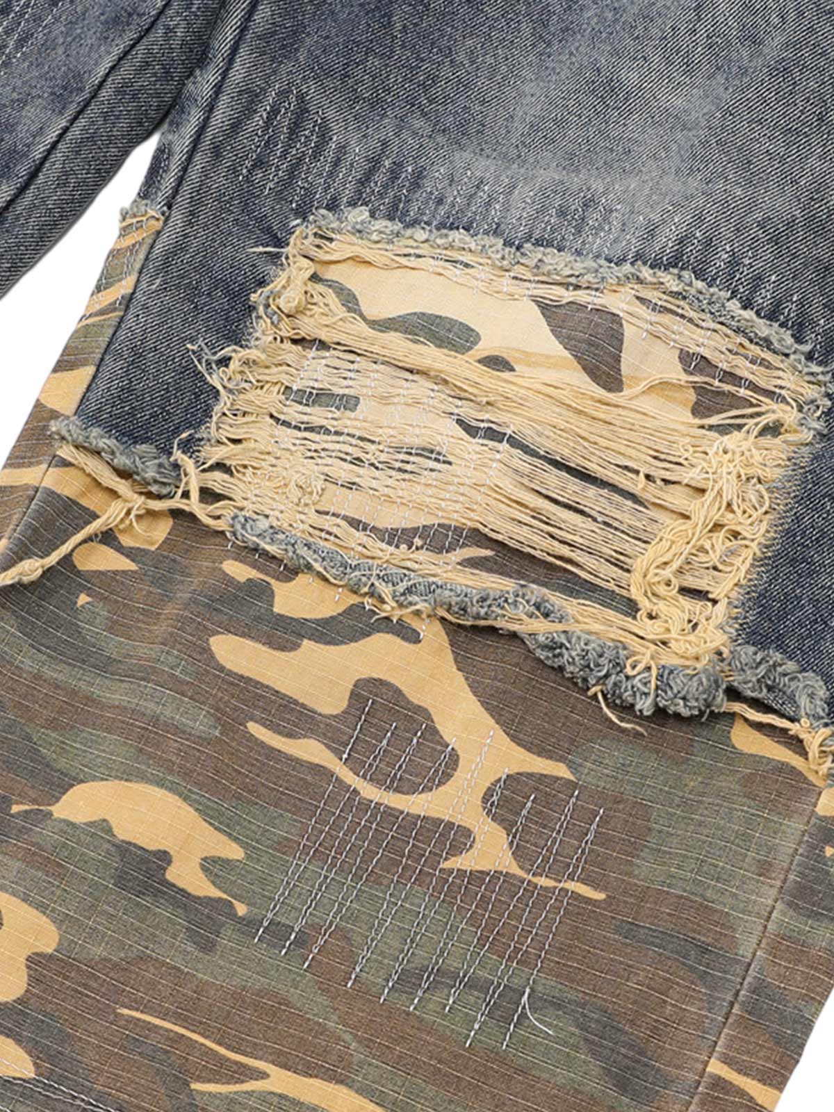 • Detail Features: Ripped details with camouflage patches, wide-leg cut, high-rise waist