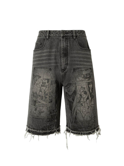 Retro Cartoon Graffiti Washed Ripped Tassel Jorts