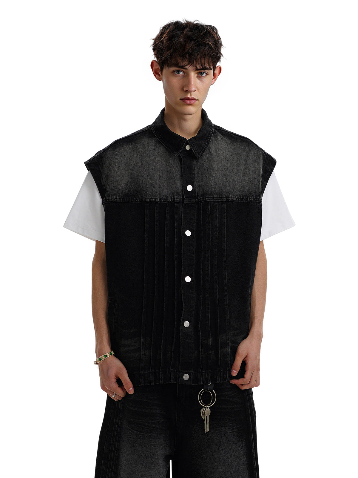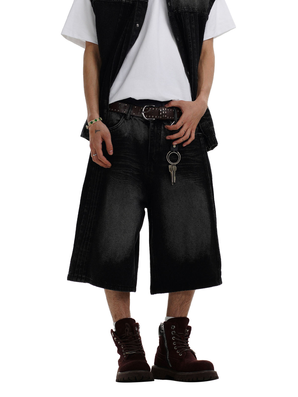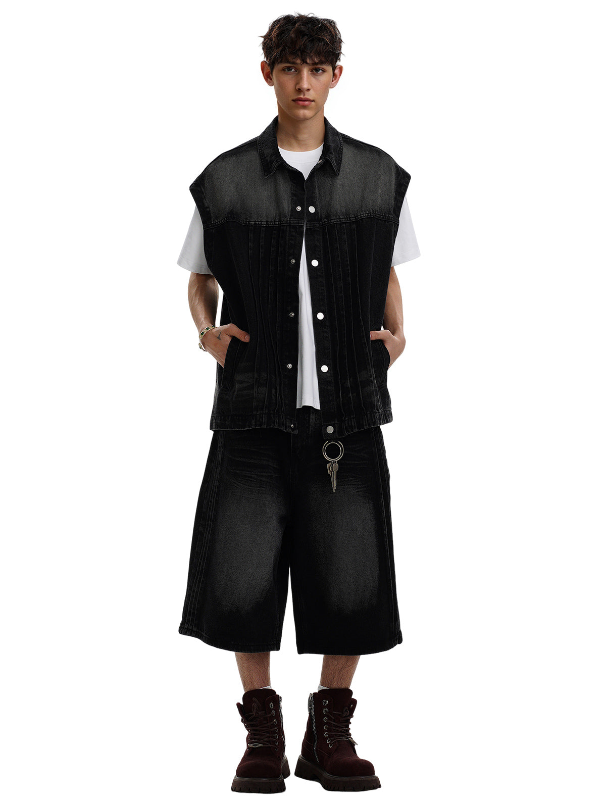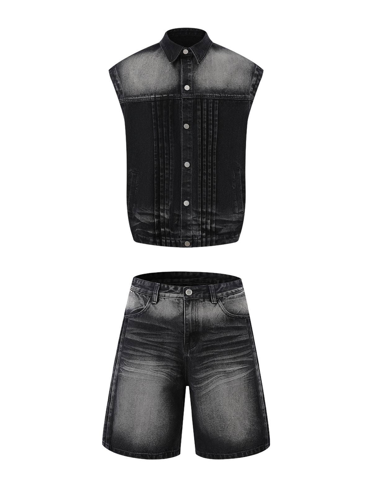 Distressed Washed Pleated Vest Jorts Denim Suit