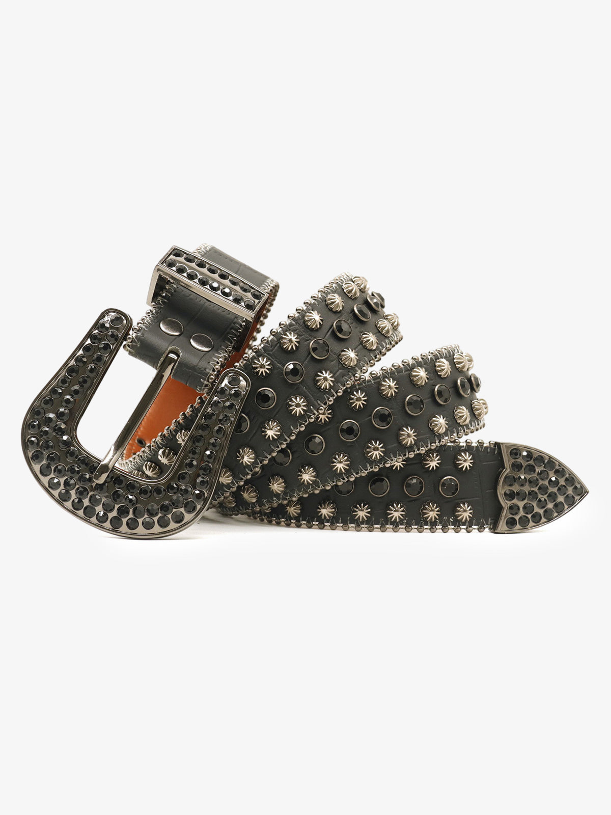 • Design Elements: Intricate studded patterns, bold buckle design, decorative rivets