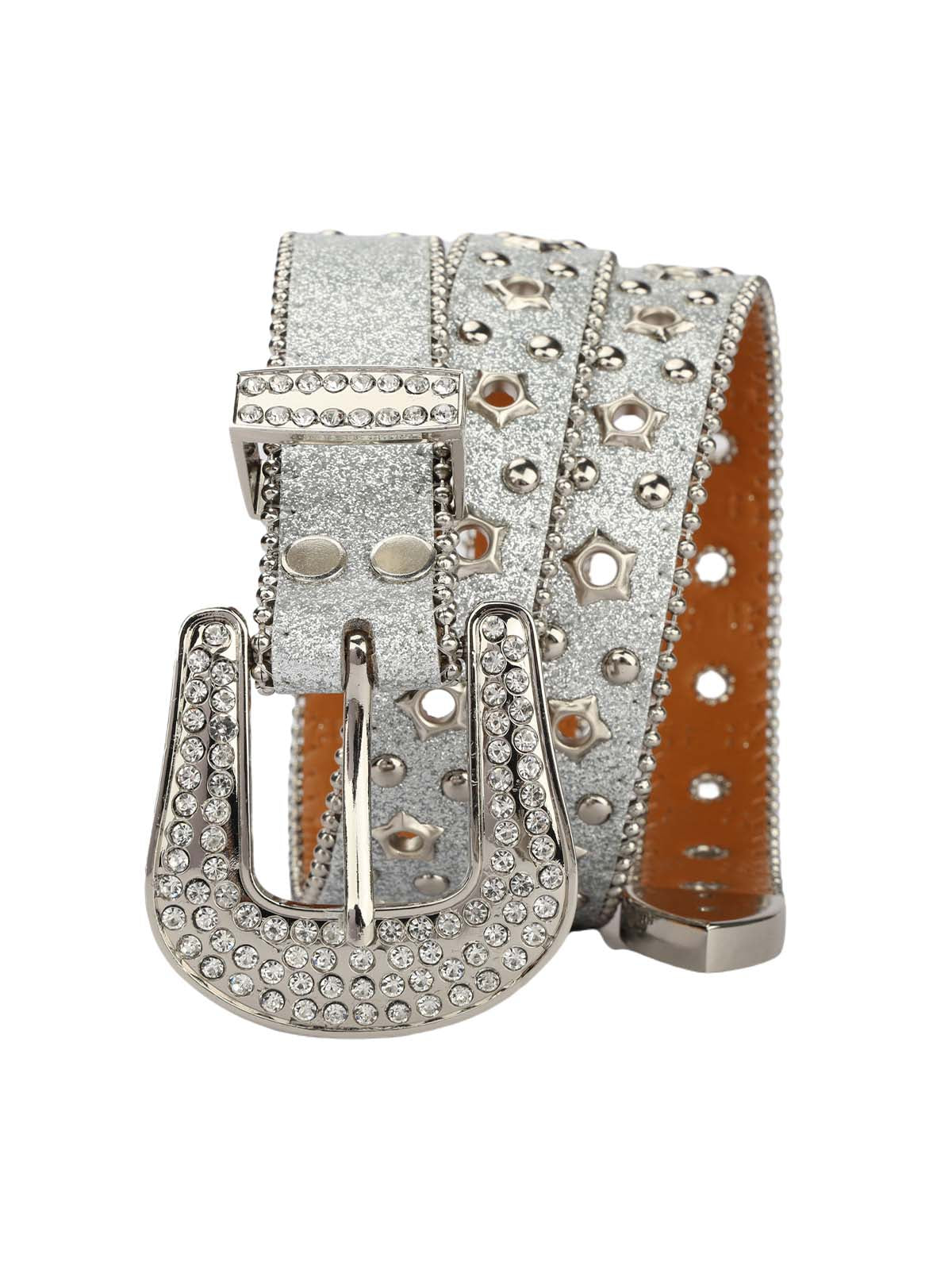 • Design Elements: Rhinestone-embellished buckle, studded details, glittery finish