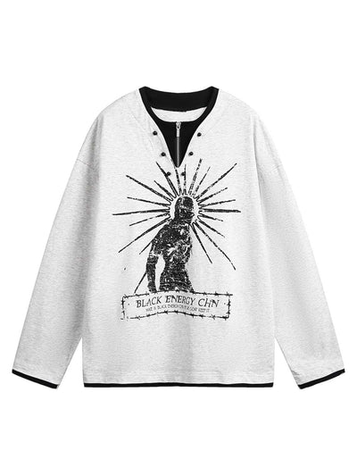 Retro Portrait Print Faux Two-Piece Long Sleeve T-Shirt - 2316