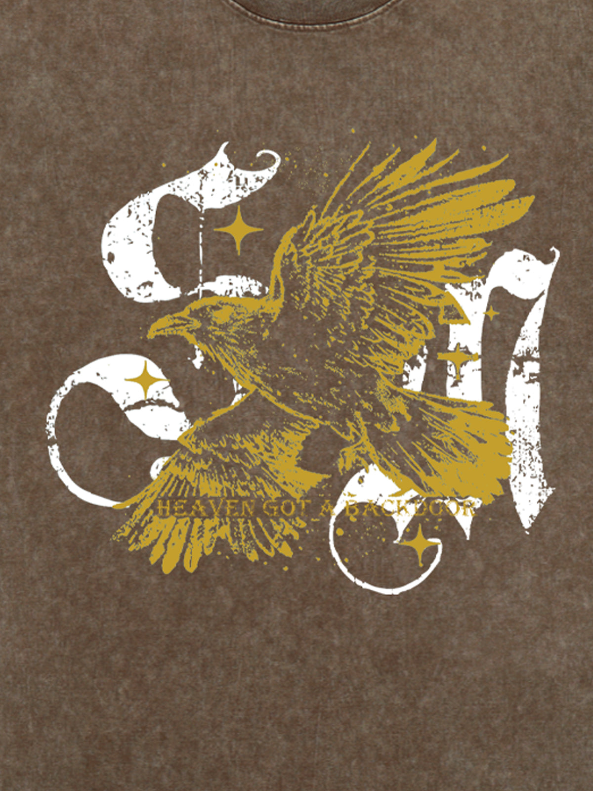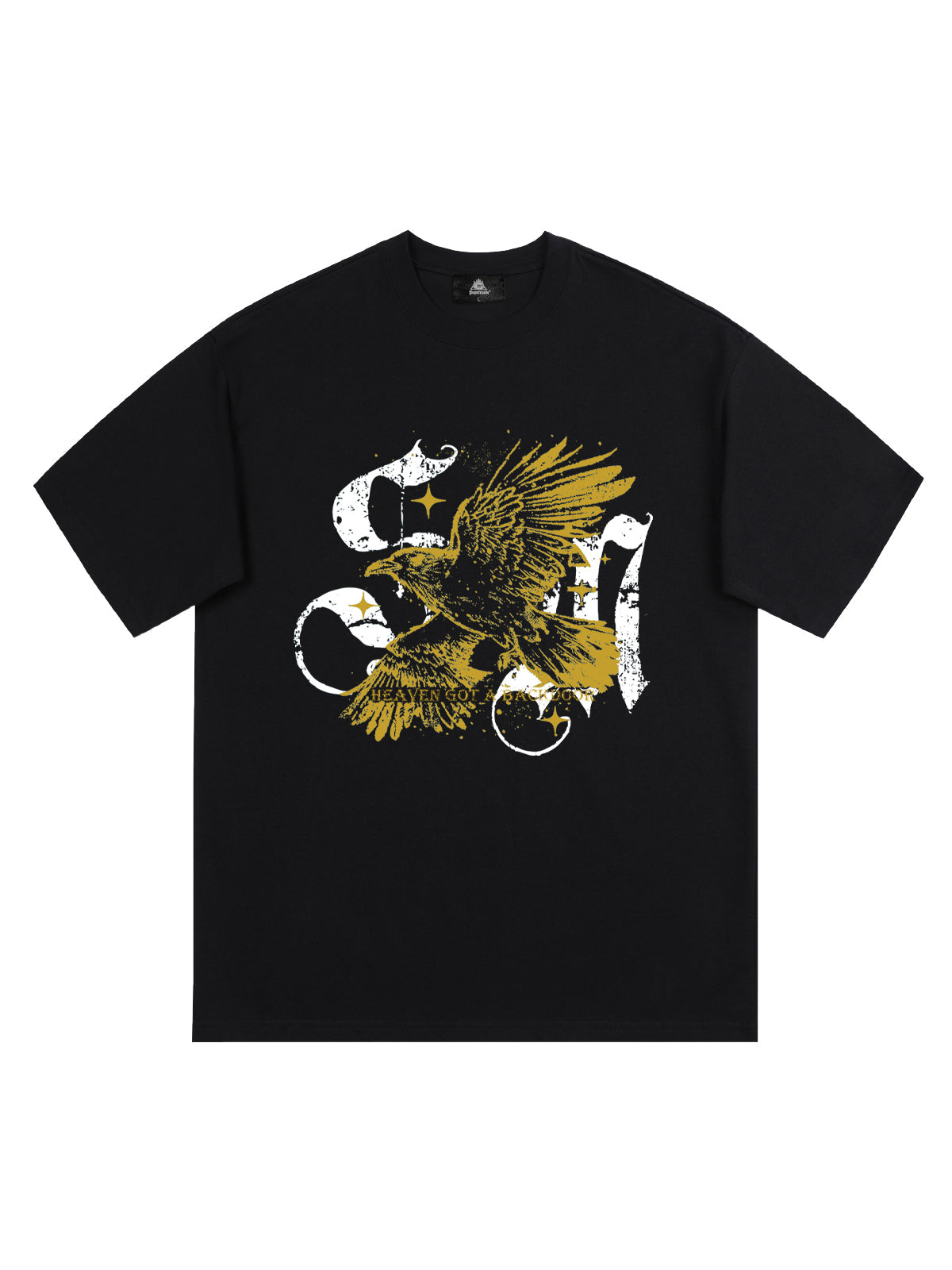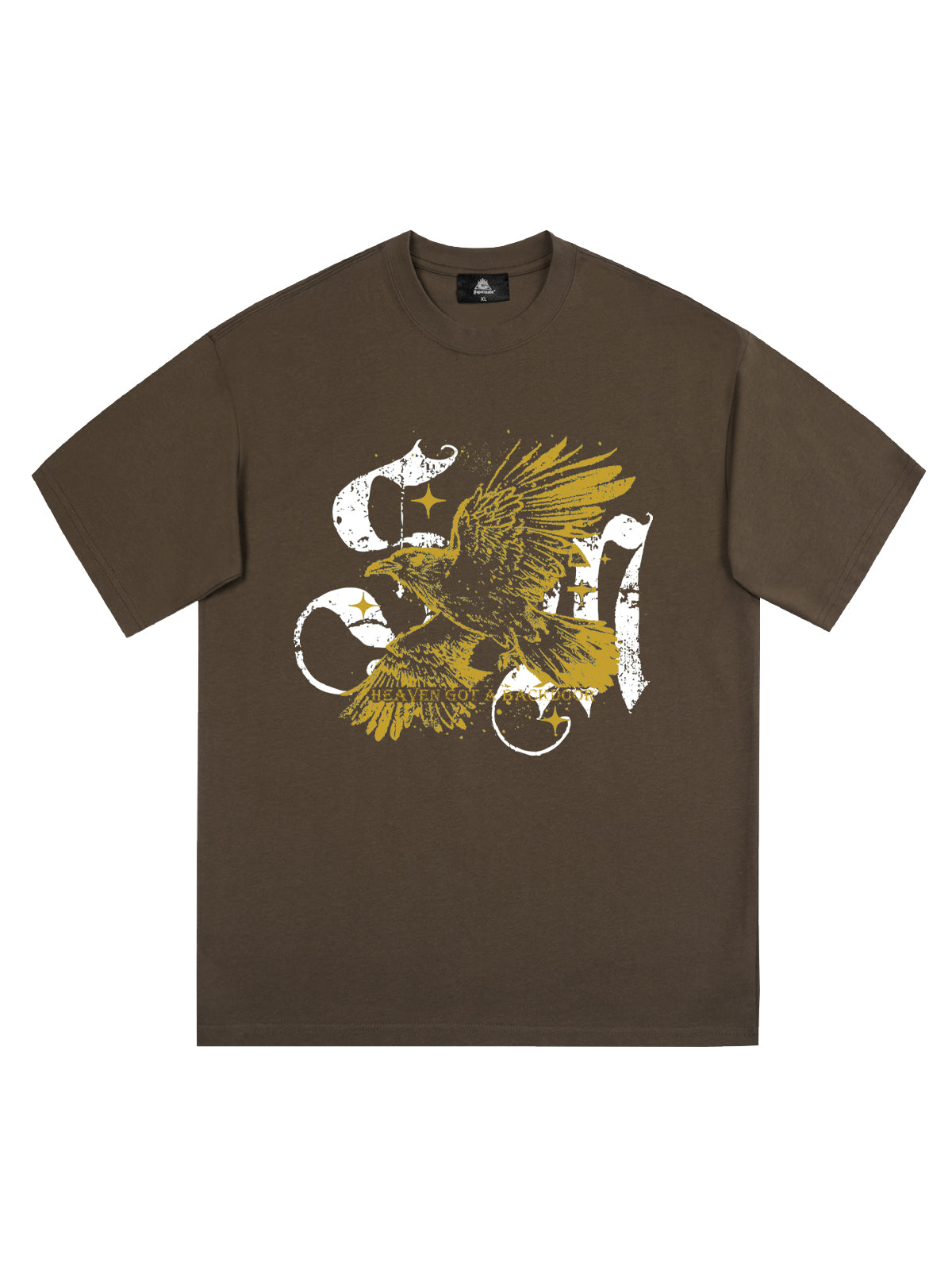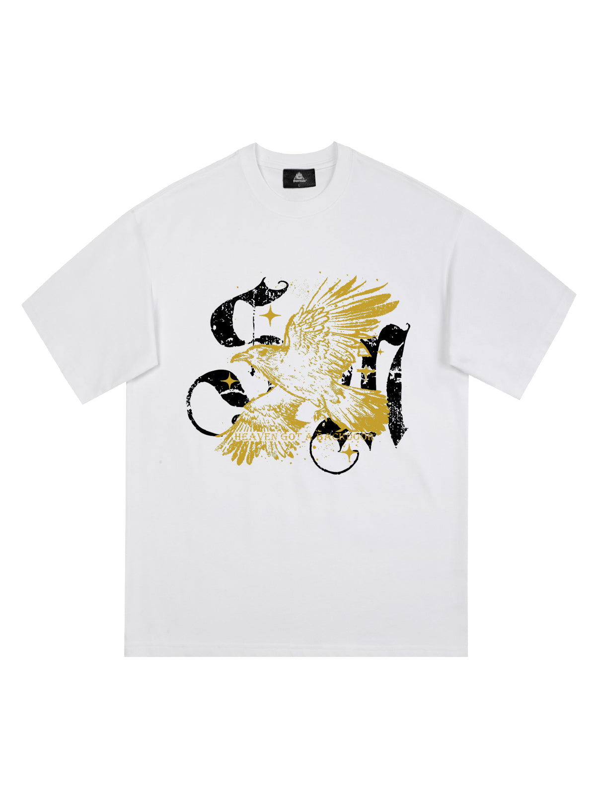 • Design Elements: Bold eagle graphic print, distressed look, white and yellow accents