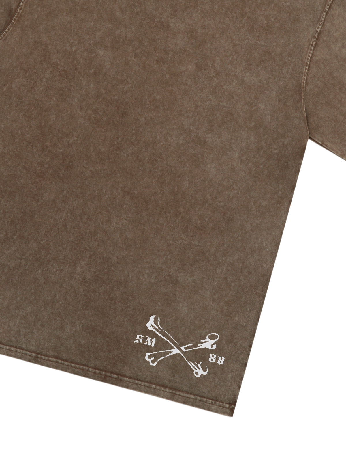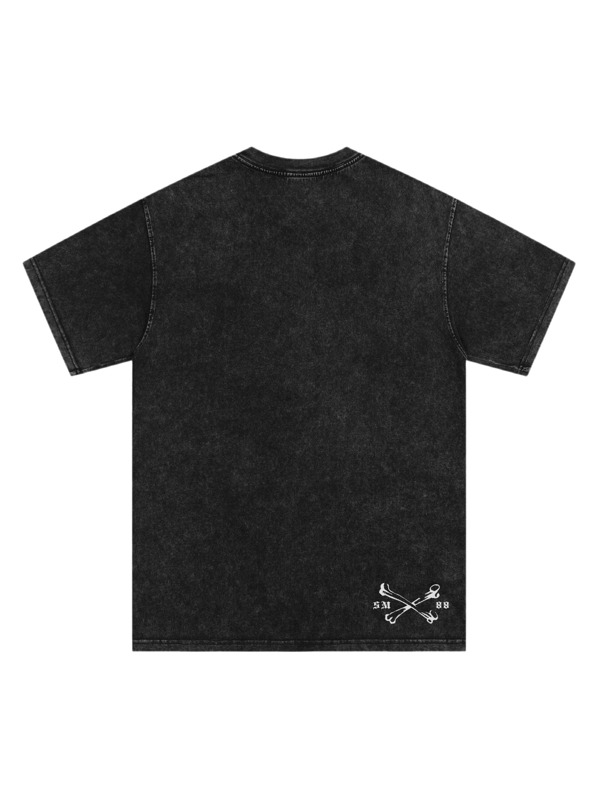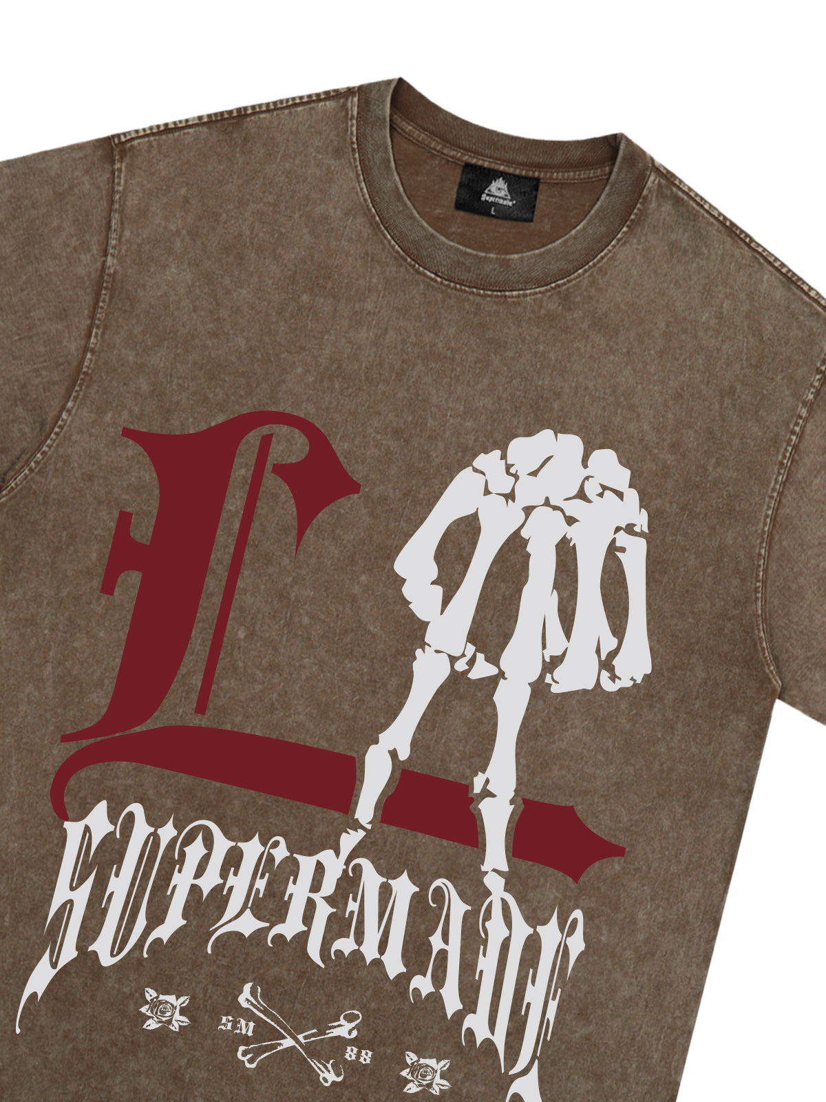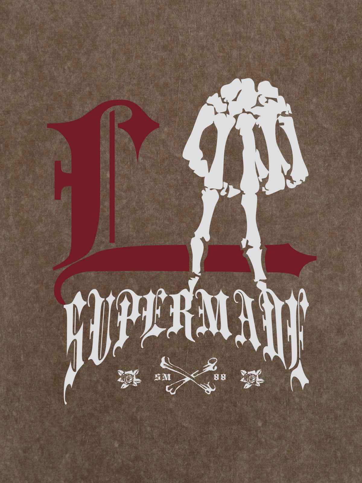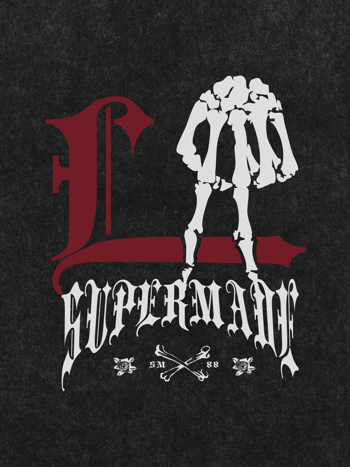 • Design Elements: Bold graphic print with a skeleton motif, striking red lettering, intricate gothic font