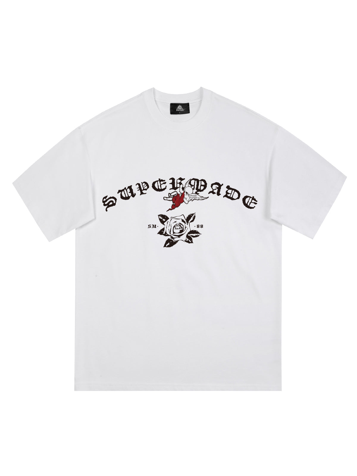 • Design Elements: Bold graphic print with floral motifs, classic crew neck design