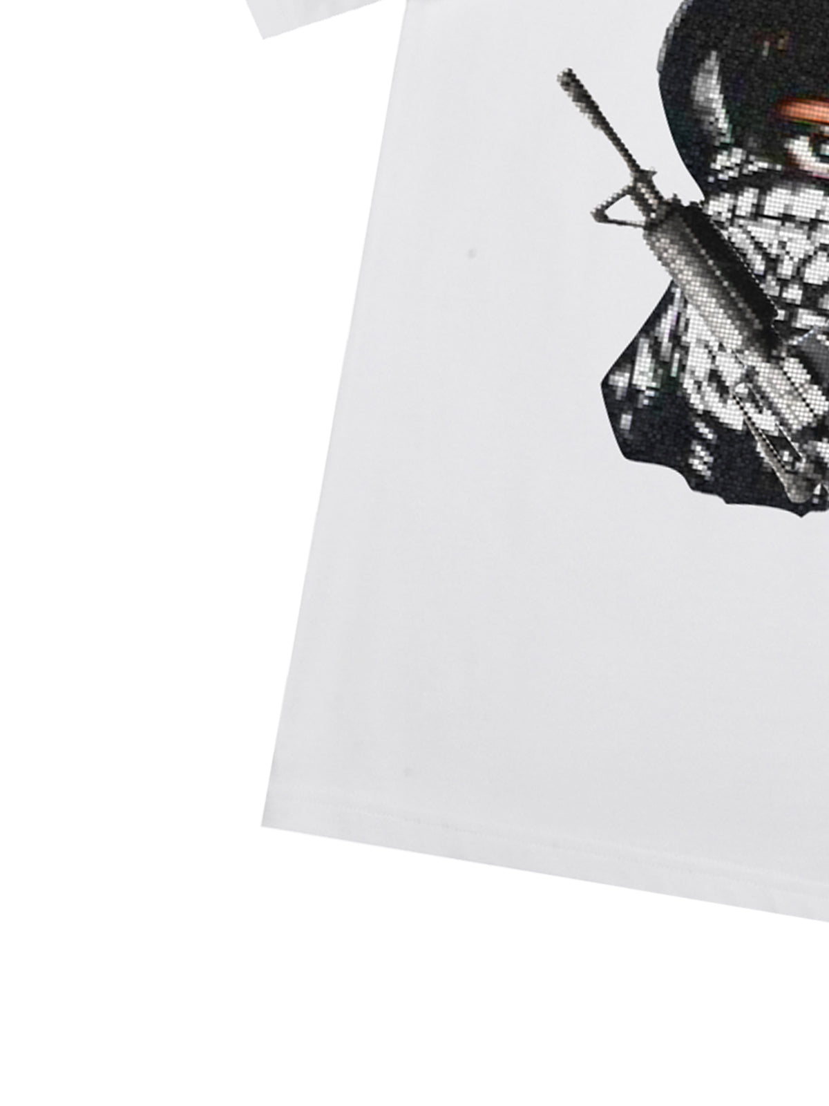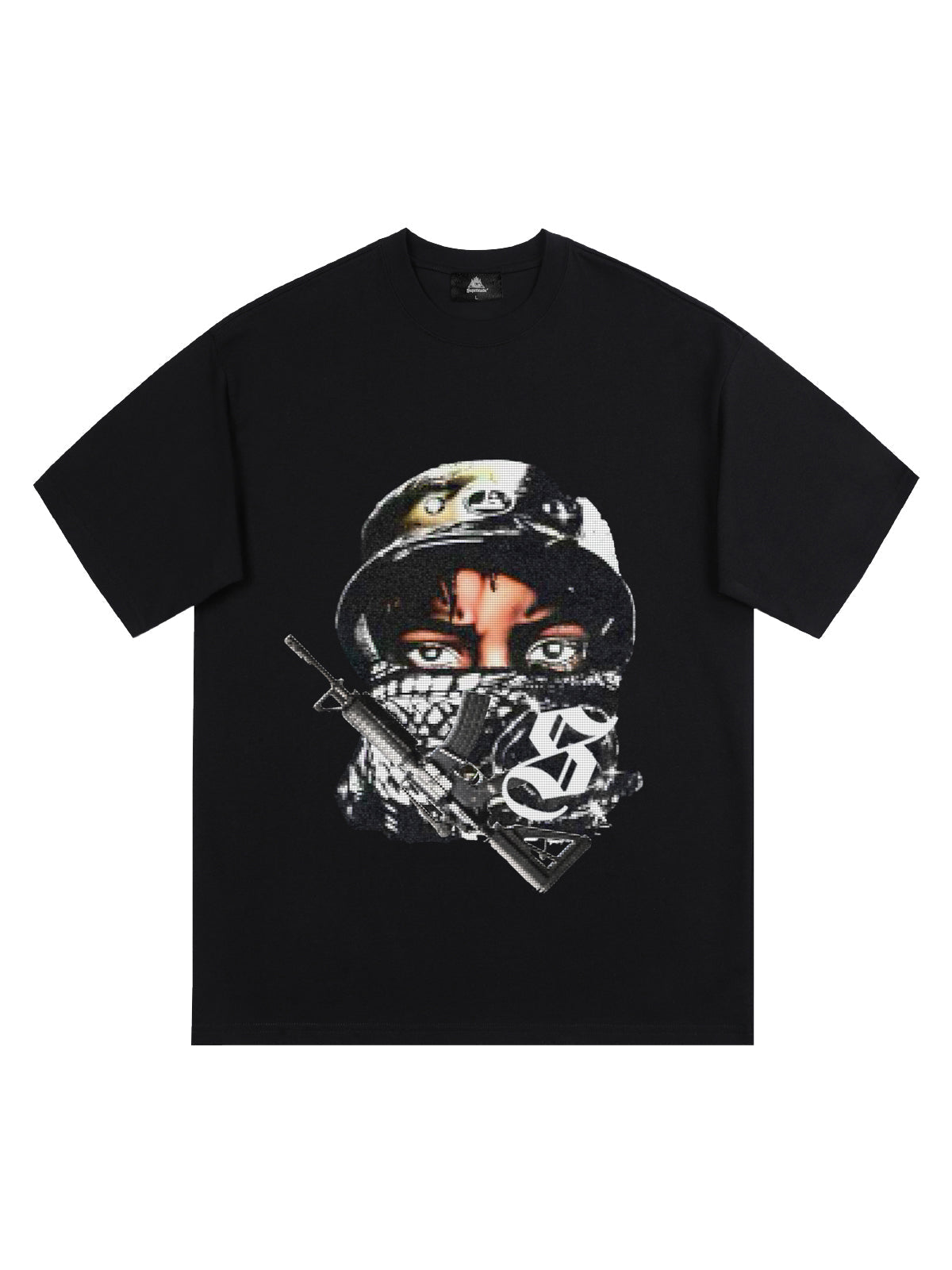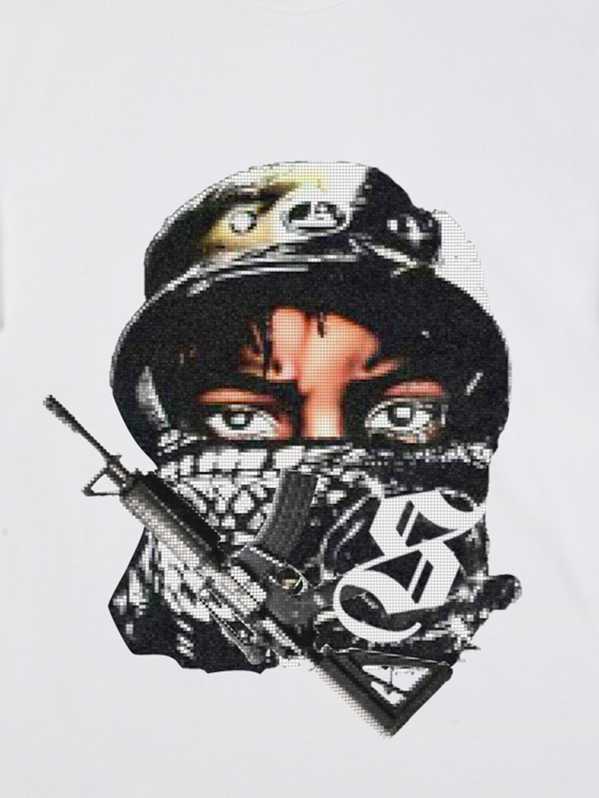 • Design Elements: Bold graphic print featuring a soldier with a bandana and weapon, pixelated effect for modern appeal