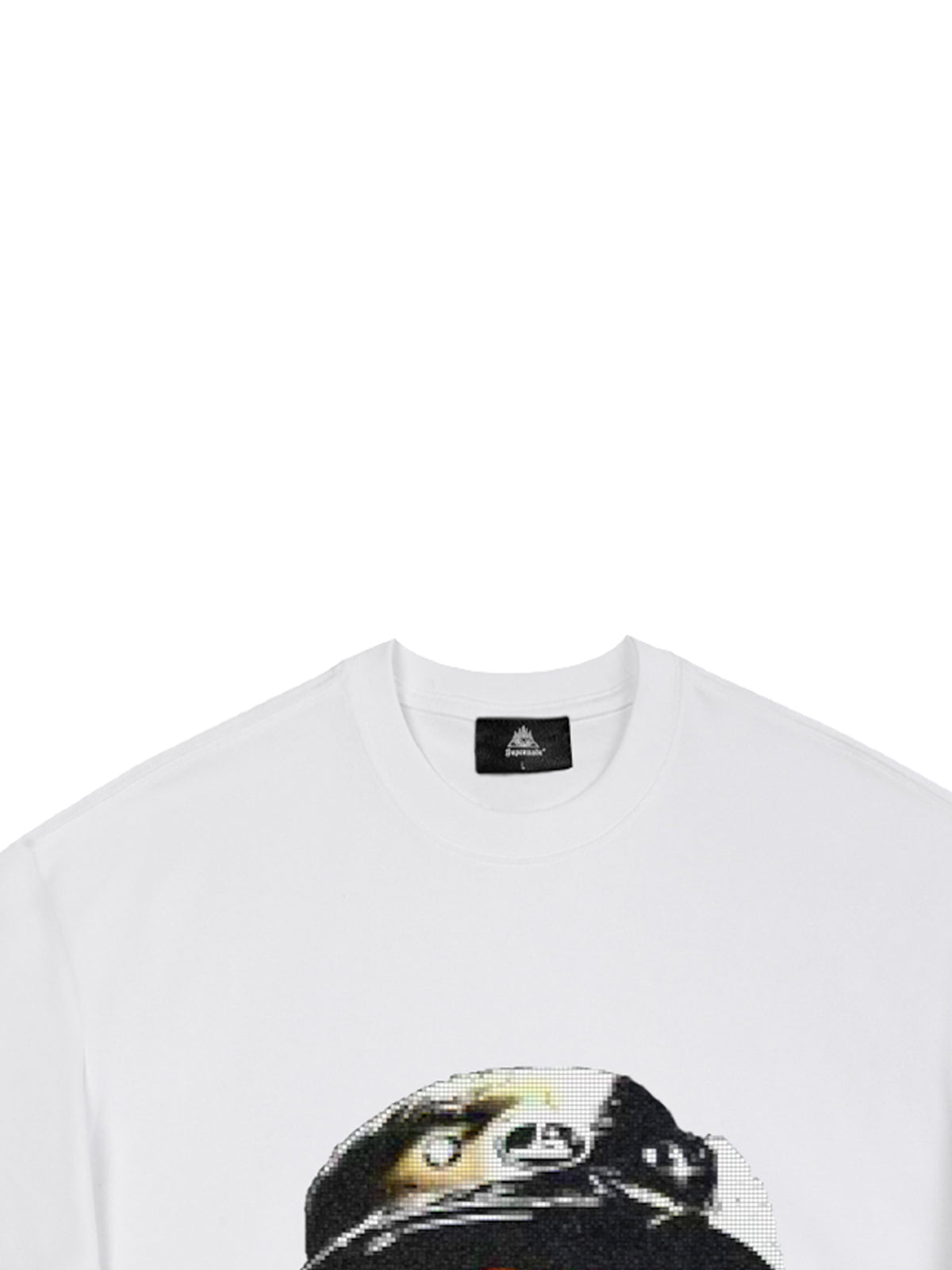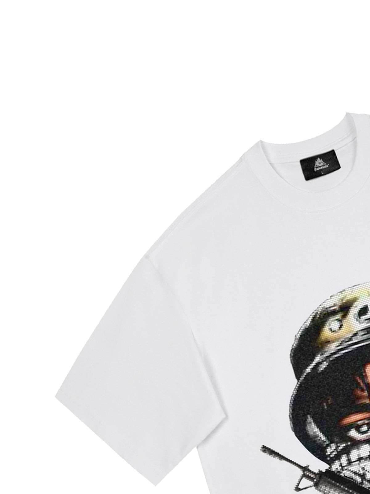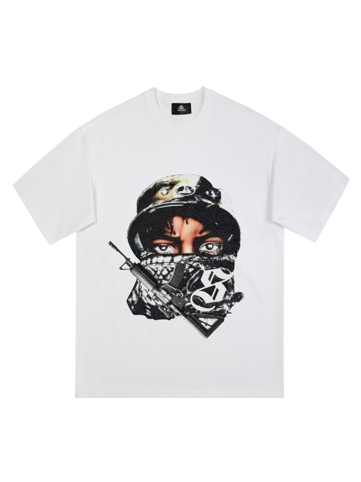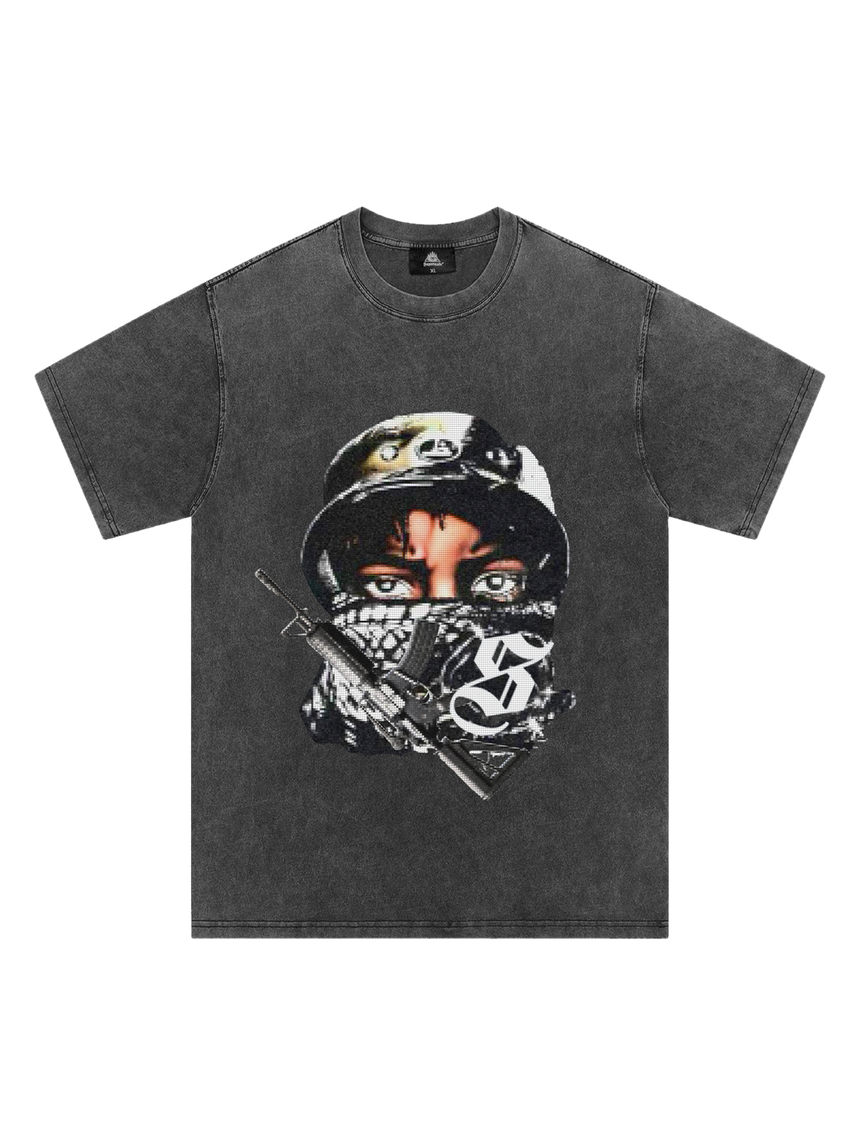 • Design Elements: Bold graphic print featuring a soldier with a bandana and weapon, pixelated effect for modern appeal