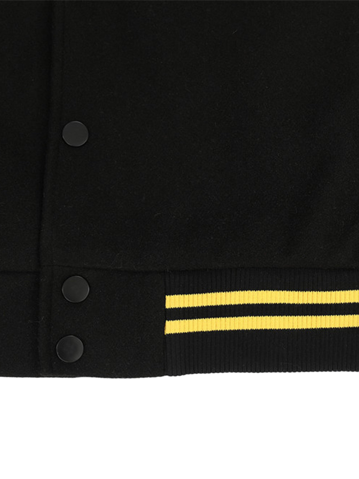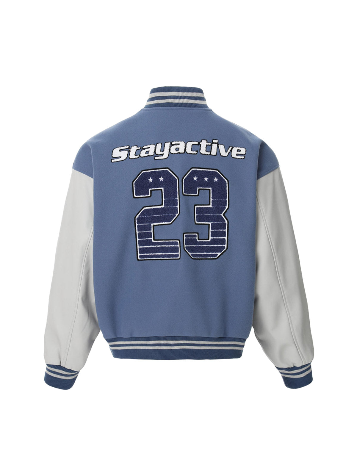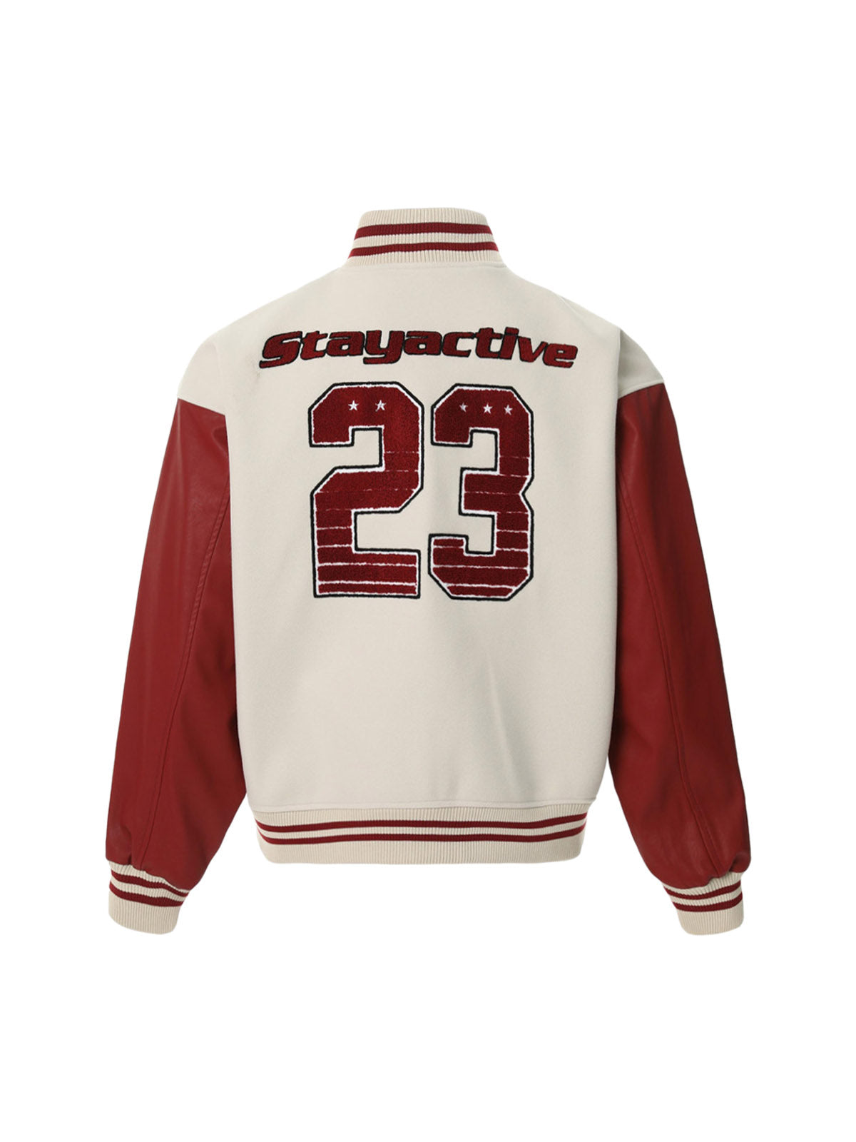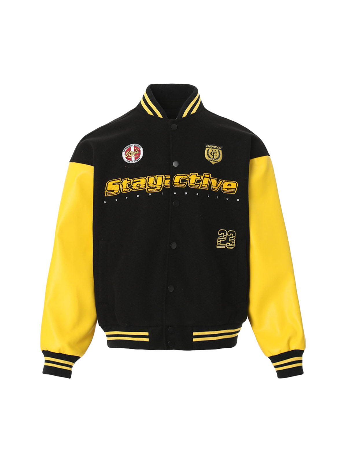 • Stylish color block design with contrast sleeves for a classic varsity look
